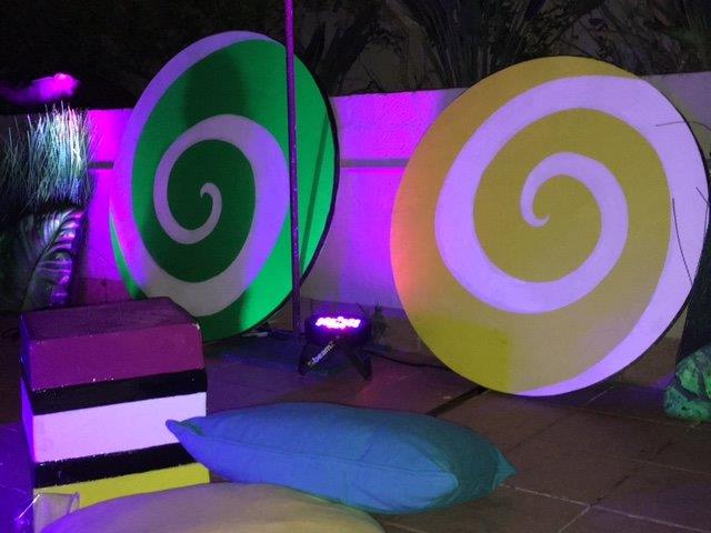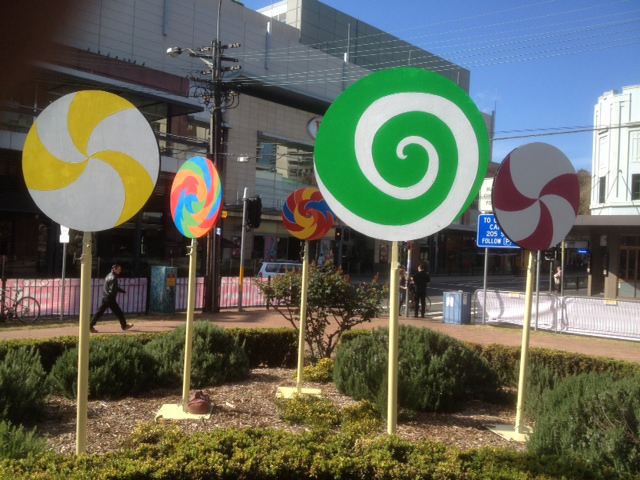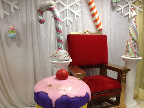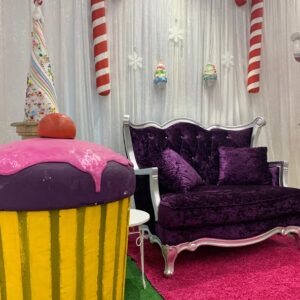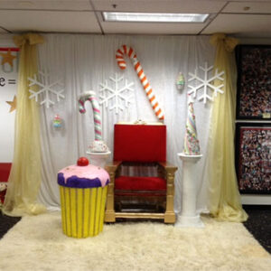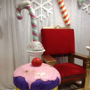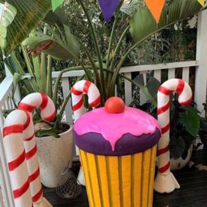 Giant cupcakes, giant candy canes and giant lollipops are some of the candy props available for hire in our Candyland prop theme. Candy bars & market carts with fairy floss & popcorn are a popular hire. Giant liquorice-allsorts and ice creams against tall fantasy leaves and giant poppies brings WilliWonka to the party. Striped Barber Poles, chocolate wheels, photo cutouts and a jump-out cake are also amongst the candy props collection.
