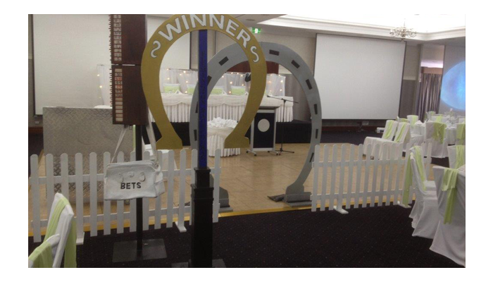 Boost your Melbourne Cup Day celebrations with props from our extensive Horse Racing / Cup Day theming. Astroturf, hay bales, and white picket fencing set the background to the giant horseshoe archways, Flemington signs, flowers arches, and Jockey flags. Colourful bunting, Horse-print banners, trophies and potted flowers add to the festive atmosphere in your venue as do the bookies bags, betting boards and giant horseshoe cutouts. The winners podium and winners arch are perfect for the finish line at your Melbourne Cup themed event.