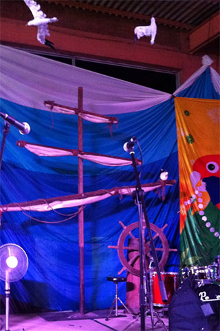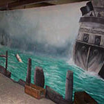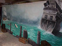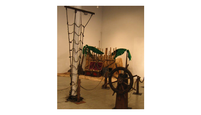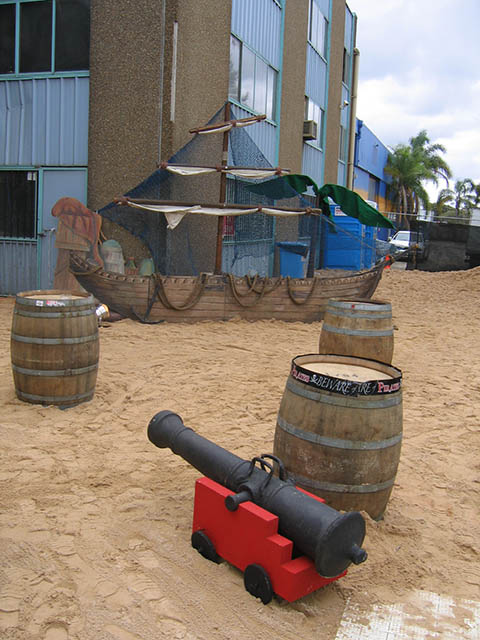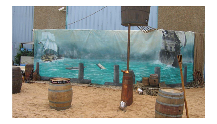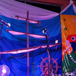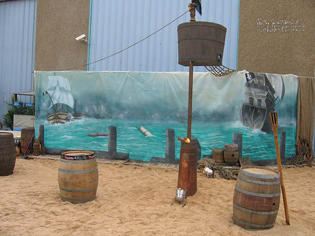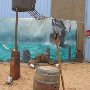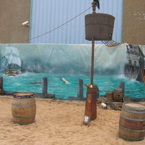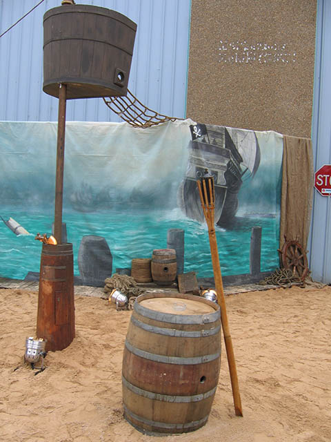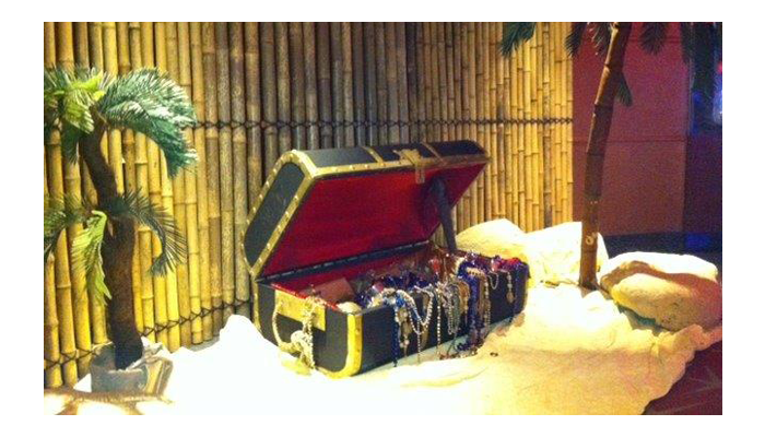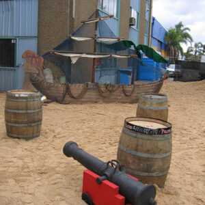Pirate Ships, barrels and cannons join telescopes and treasure chests in this elaborate tropical beach scene. Seagulls sit on top of the tall ship’s mast, rigging nets and crow’s nest against an ocean backdrop. Sandy beach and rocks hide the gold bullion and treasure chest overflowing with treasure on this desert island. Antique pirate crates filled with aged bottles are stacked below a skull and cross bone flag near a bamboo raft at this Pirate themed event. Ships lanterns, bells, pirate weapons and mooring rope make up another photo corner at the pirate event.